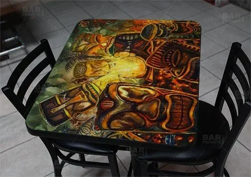 This delightful piece will look amazing used as a table top in your tiki bar or restaurant or even at home in your man cave or outdoor bar. Restaurant and bar patrons will be impressed by the full color art print. The colors are so vibrant and gorgeous that you can even hang it on your wall for display!